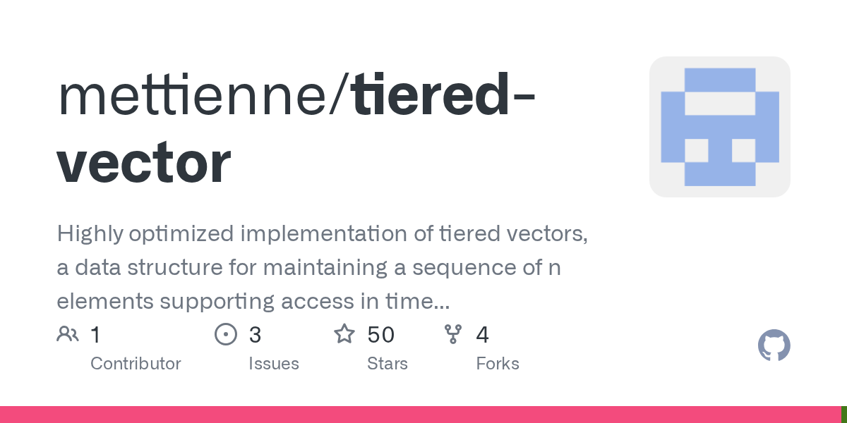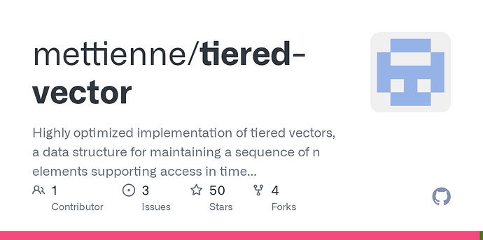 Highly optimized implementation of tiered vectors, a data structure for maintaining a sequence of n elements supporting access in time O(1) and insertion and deletion in time O(n^ε) for ε > 0 while using o(n) extra space.