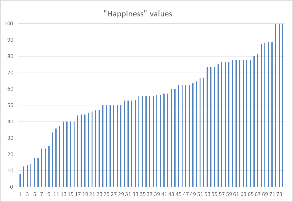 Back to the measure the bot and I co-created. It you don’t like the name “happiness”, that’s fine. It’s related in some way to satisfaction with the order in which the election method picked winners, but I wouldn’t claim it measures “actual human happiness” to even one significant digit.