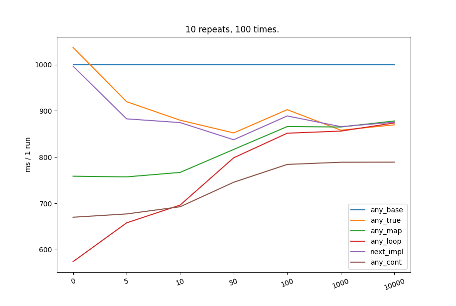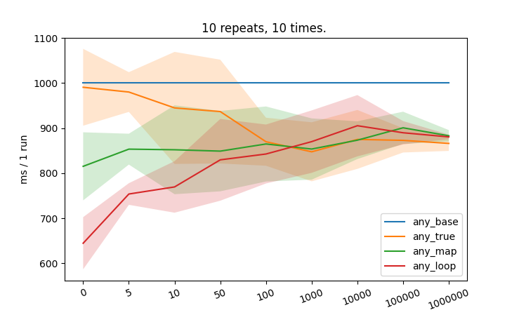 Added one more data point with 1M elements. Fewer repetitions, so not as accurate as the one above. It seems that any_true performs best for large sequences.