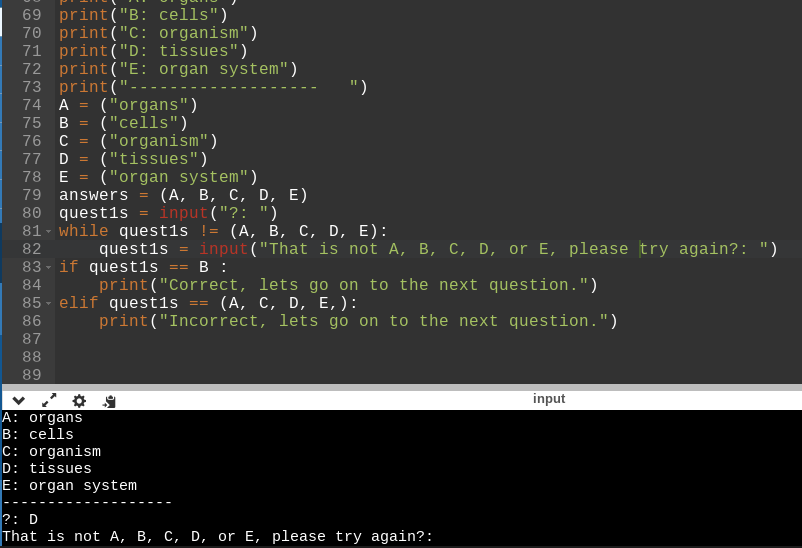 quest1s = input("That is not A, B, C, D, or E, please try again?: ")