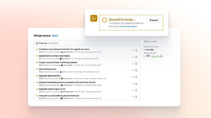Merge queue helps increase velocity in software delivery by automating pull request merges into your busiest branches.