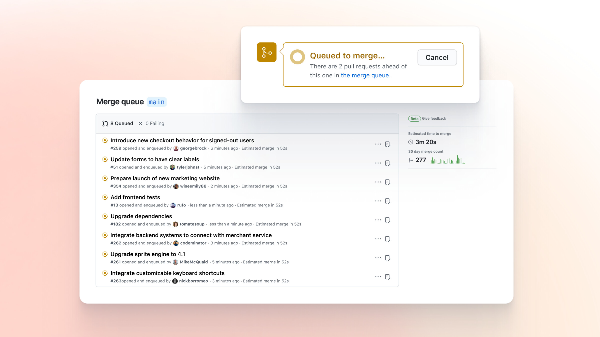 Merge queue automates this process by ensuring each pull request queued for merging is built with the pull requests ahead of it in the queue.