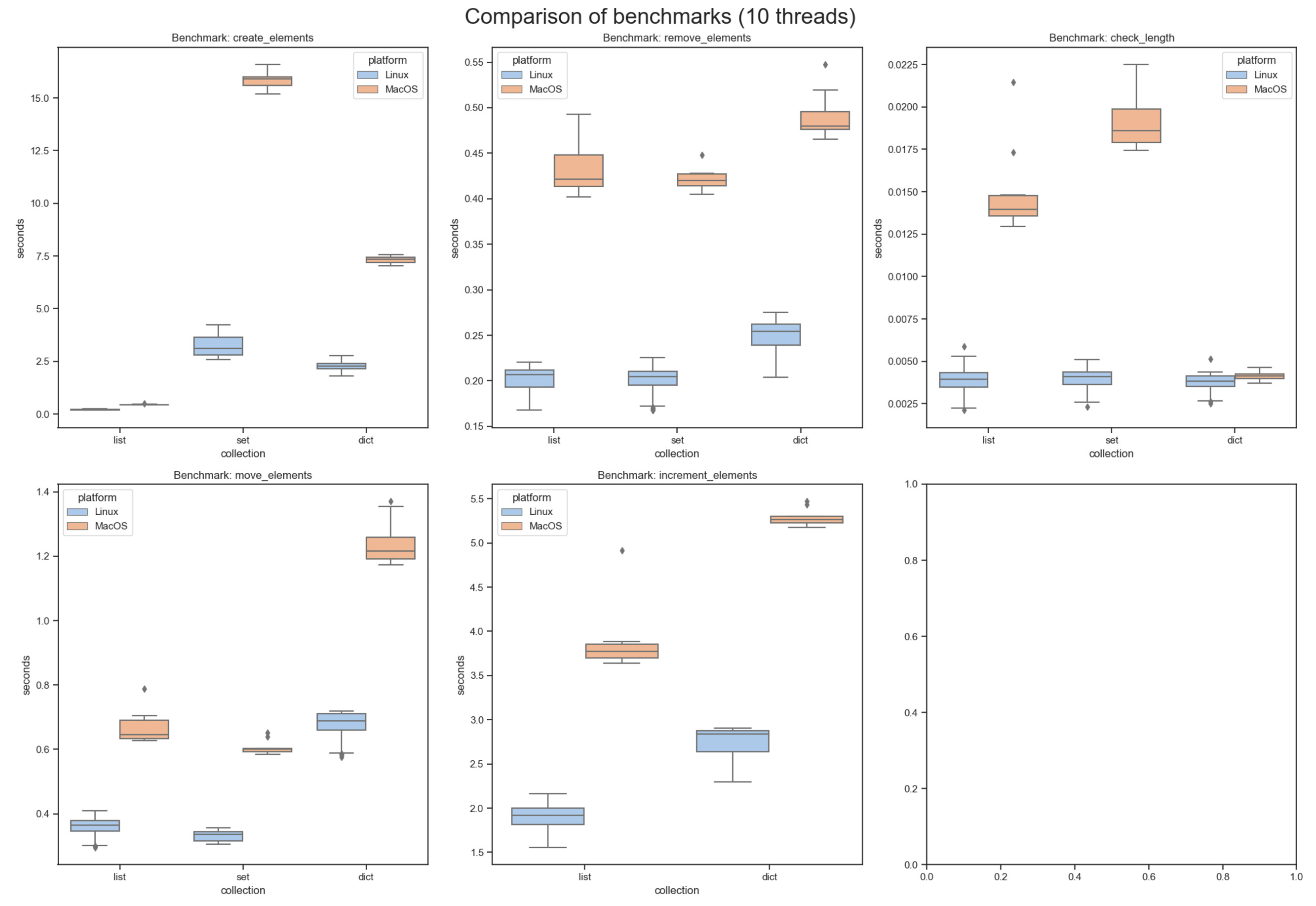 Hello everybody. I was testing free-threaded Python on my Mac (through uv’s cpython-3.13.0+freethreaded-macos-x86_64-none) and noticed that multi-threaded access to collections was VERY slow. I did a quick comparison of different benchmarks that include simple operations like appending/adding elements, removing elements, etc and ran them both in Linux and Mac and the difference is astonishing.