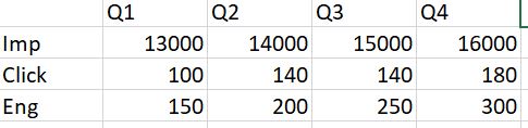 Here though it looks like you are missing a : after 'Q4' . You are making a DataFrame by passing in a dictionary and so it should look like {key: value, key_2: value_2} where here the keys are the column names and the values are the data for each column.