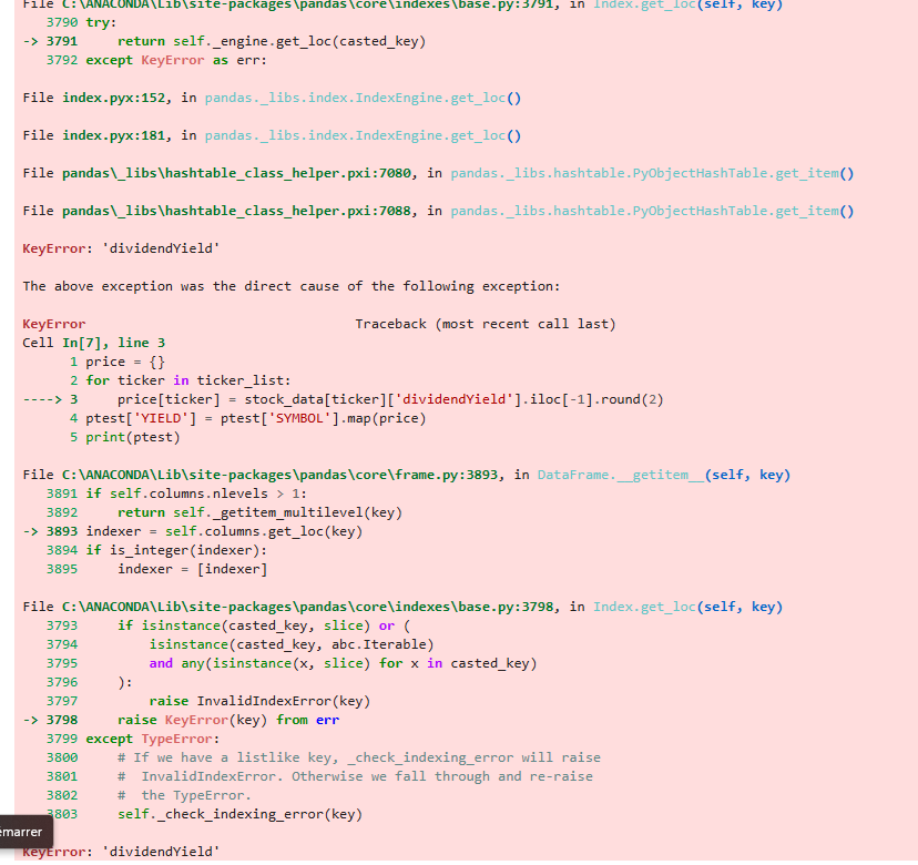 I have an excel sheet with stock tickers. I want to build a dataframe with the PRICE and the DIVIDEND. 1st column: tickers (from the excel file), 2nd column: last price (I’m able to get the prices from yf). But I am not able to get the dividend. Thank you for your input!