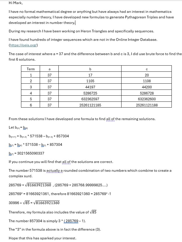 Explanation (which is much longer than the code): as before, we recast the problem in terms of finding pairs (A, B) of nonnegative integers satisfying A^2 - 85B^2 = -85\cdot 37^2. I’ll call those pairs “solution pairs”. Here A is the area of the Heron triangle, and B = 2b + 3, so the side lengths of the triangle are 37, (B - 3)/2 and (B + 3)/2.
