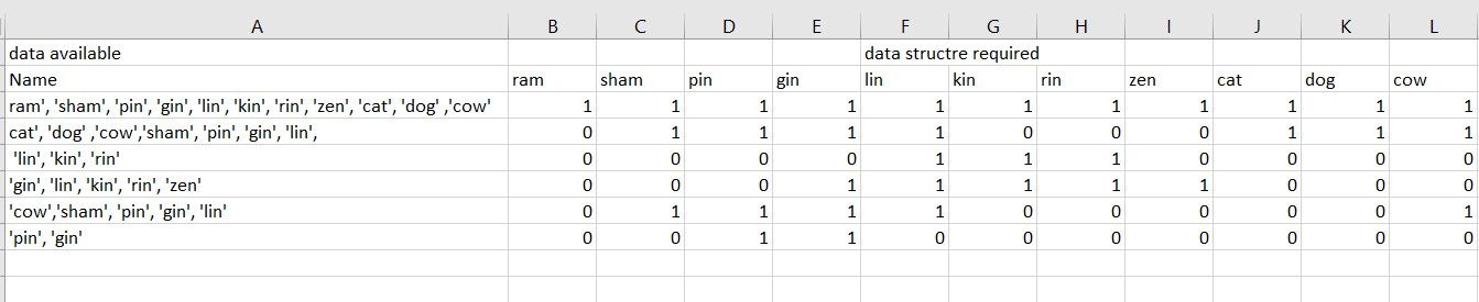 We want to get data as per “Data Structure required” from “Data Available”. It’s basically in the form of a Term document matrix. We make all the unique names present in Name columns, an individual separate column. Whichever name is present in the corresponding row, that column’s name will be assigned with 1, the rest of the rows will become 0 as shown in the XLSX file. Looking forward to a solution.