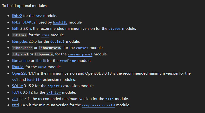 The proposal is to list optional dependencies and their supported versions on 3. Configure Python — Python 3.14.0 documentation , it seems like a logical place to find build requirements. E.g. currently zstd and zlib are missing from the list.