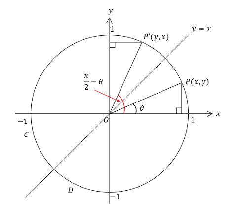 I’m fine with this part too: the cofunction identity here can be geometrically illustrated by taking the unit circle and flipping it over the y = x line. This way, cos becomes sin and sin becomes cos for the new angle going from the top of the unit circle to the projected point.
