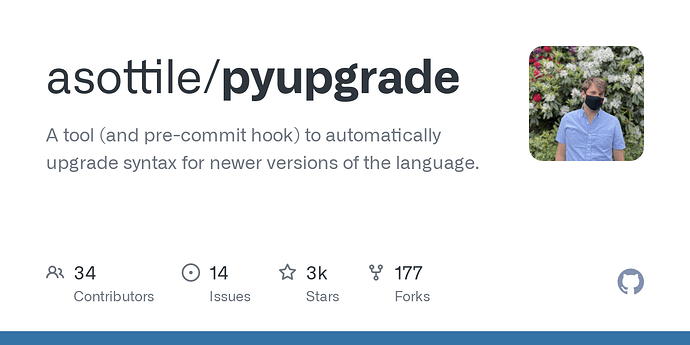 You might also want to consider Ruff, which implements all the Pyupgrade autofixers as well as hundreds of others, while running much faster due to being written in Rust. Additionally, I’m currently working on infrastructure that will allow exposing a substantial substantial amount of information on additions, changes, deprecations and removals to the language in programmatic form, which such tools could then consume to even more comprehensively identify, and in some safer automatically resolve, changes between Python versions.