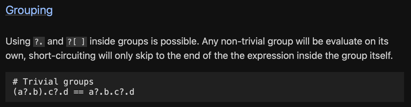 I’m currently working on improving my draft, just wanted to respond quickly to it. Where exactly is it a deviation from the spec? I explicitly called out Trivial groups being equal here: PEP 999 – None-aware access operators | peps.python.org