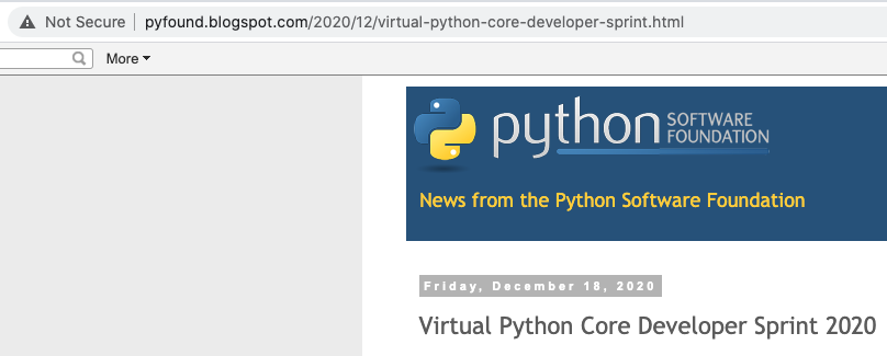 I followed the link in that tweet (https://t.co/uStov61i48?amp=1), and it brought me to http://pyfound.blogspot.com/2020/12/virtual-python-core-developer-sprint.html. My web browser indicated that it is “Not Secure”. (Google Chrome Version 87.0.4280.88 )